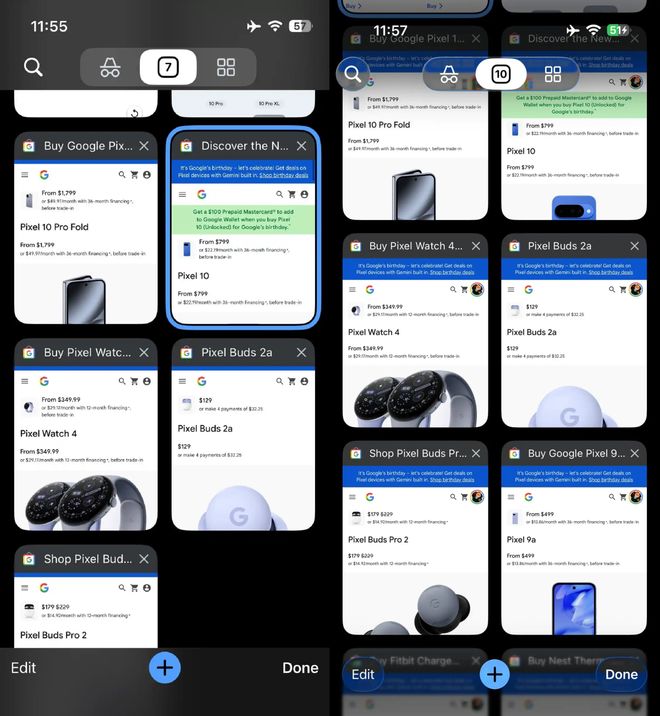 - 標簽頁網格界面:無痕模式、標簽頁切換、標簽組切換以及左側的搜索功能均采用新樣式,“編輯”和“完成”按鈕也同步調整。