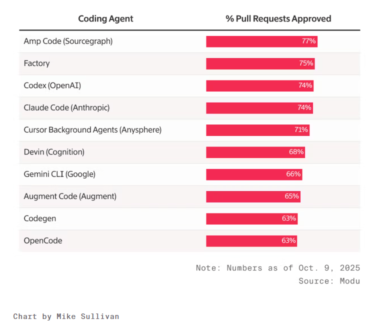 10月9日,據(jù)初創(chuàng)公司Modu收集的超過(guò)30萬(wàn)個(gè)代碼拉取請(qǐng)求的數(shù)據(jù)顯示,開發(fā)者對(duì)Codex生成的代碼批準(zhǔn)率達(dá)到了74.3%,略高于Claude Code的73.7%。