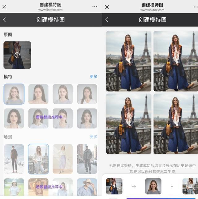 根據(jù)提供的商品圖和可供換裝的模特圖,商家可以迅速制作出“上身效果圖”。