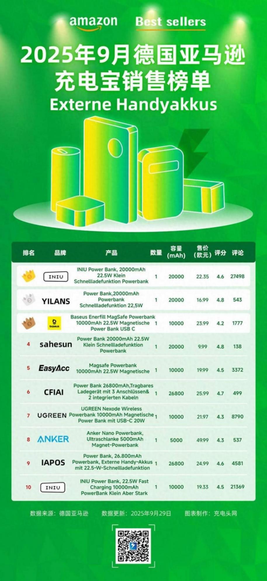 本次充電頭網統計了2025年9月德國亞馬遜10款銷量最好的充電寶,分析德國消費者對充電寶購買的喜好,也希望能給工廠出海充電寶和海外買家選品方面提供參考。統計日期為2025年9月29日,后續產品的排名、價格、評分、評論數或有波動,均以當時的數據為準。