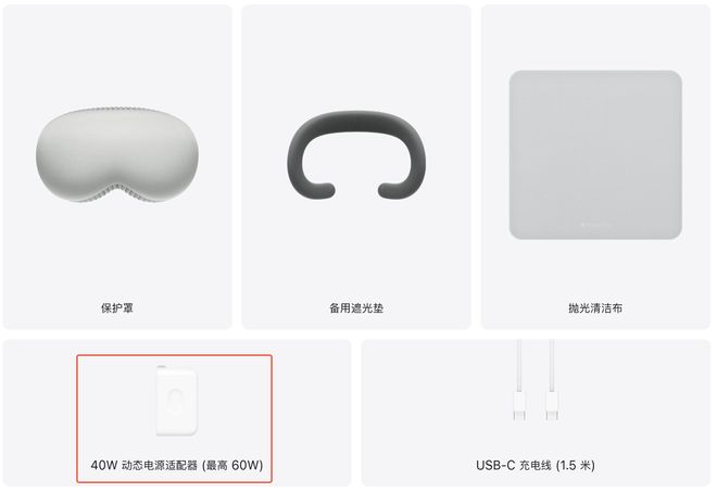 不過蘋果為 2025 款 Vision Pro 升級了配件,在中國、美國、加拿大等部分國家和地區,新款 Vision Pro 隨附的充電器已從前代的 30W USB-C 電源適配器升級為全新的 40W 動態電源適配器,其峰值輸出功率可達 60W。