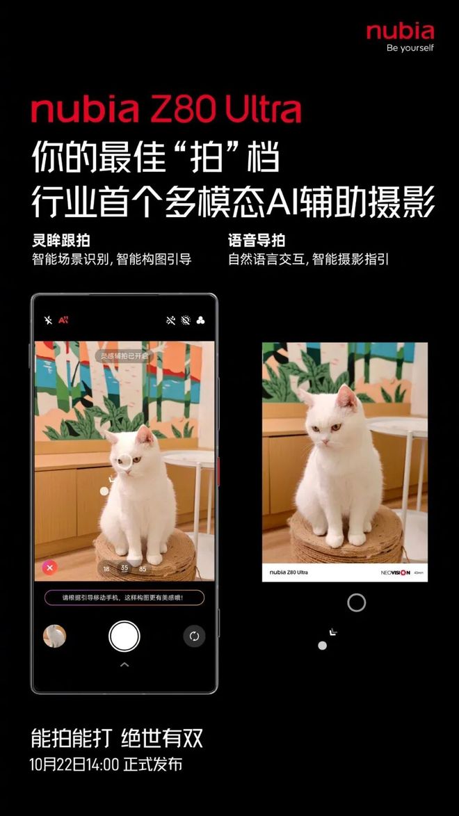 努比亞Z80 Ultra帶來行業首個多模態AI輔助攝影,支持靈眸跟拍和語音導拍。