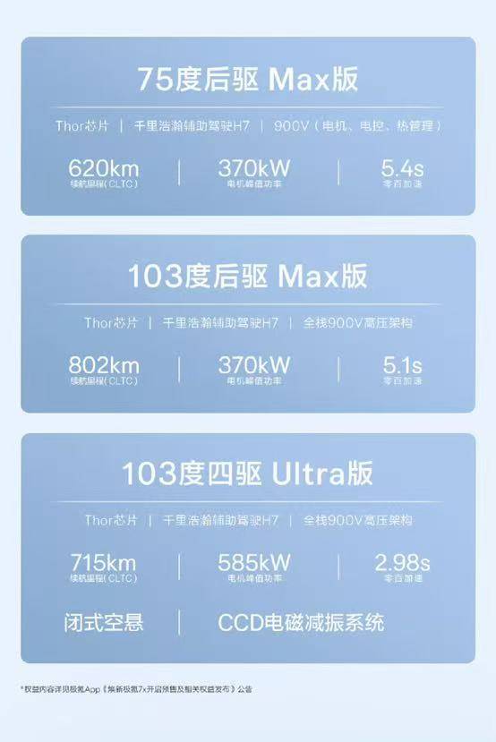 據(jù)官方公布的信息顯示,新款極氪7X 75度后驅(qū)Max版將搭載370千瓦的驅(qū)動電機(jī),匹配75千瓦時神盾金磚電池,CLTC工況純電續(xù)航里程620公里。103度后驅(qū)Max版、103度四驅(qū)Ultra版基于全棧900伏高壓架構(gòu)打造,配套103千瓦時麒麟電池,其中103度后驅(qū)Max版CLTC工況純電續(xù)航里程802公里,驅(qū)動電機(jī)最大功率370千瓦;103度四驅(qū)Ultra版前后雙電機(jī)總功率達(dá)到585千瓦,CLTC工況純電續(xù)航里程715公里,并帶有CCD電磁減振系統(tǒng)和閉式空氣懸架。
