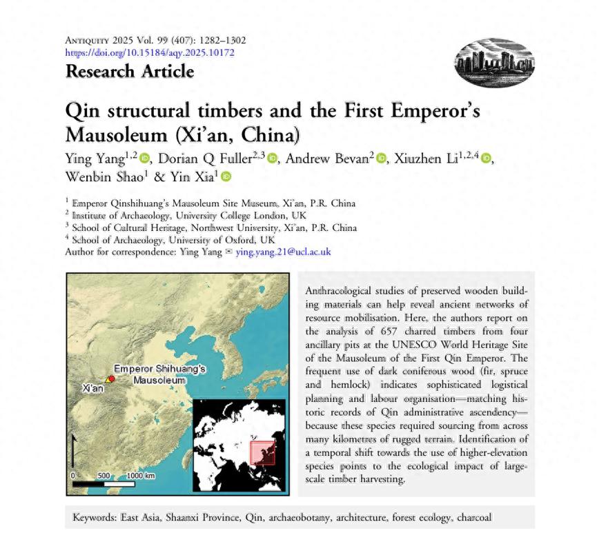 近日,秦始皇帝陵博物院與英國倫敦大學學院在國際權威考古期刊《Antiquity》上聯合發表的一項研究,首次系統揭示了秦陵木質建筑的用材之謎,為理解秦帝國龐大的資源動員體系提供了全新實物證據。