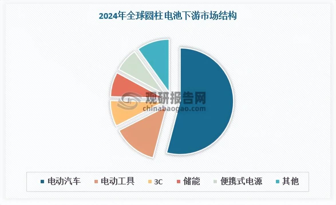 按應用場景,圓柱電池分為消費電子類、動力類、儲能類,近年來受益于新能源汽車需求增長及儲能產業發展,全球圓柱電池出貨量持續增多。根據數據,2024 年全球圓柱電池出貨量達128.2 億只,同比增長 3.6%;其中電動汽車為最大下游市場,占比超50%;其次是電動工具與3C,分別占比13.4%、7.9%;儲能領域需求顯著上揚,與3C占比差距縮小。