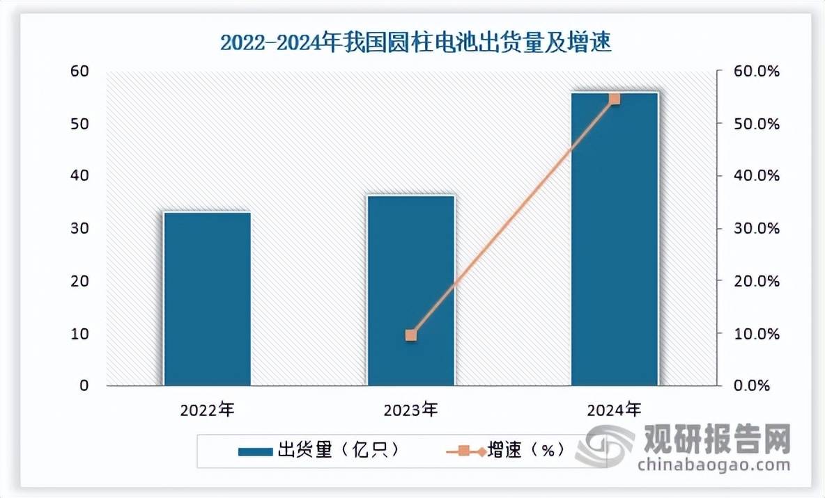 從國內市場看,我國領跑全球新能源產業,國內圓柱電池近年出貨量實現大幅增長。2024年我國圓柱電池出貨量為56億只,增速50%+,遠超全球平均水平(3.6%)。
