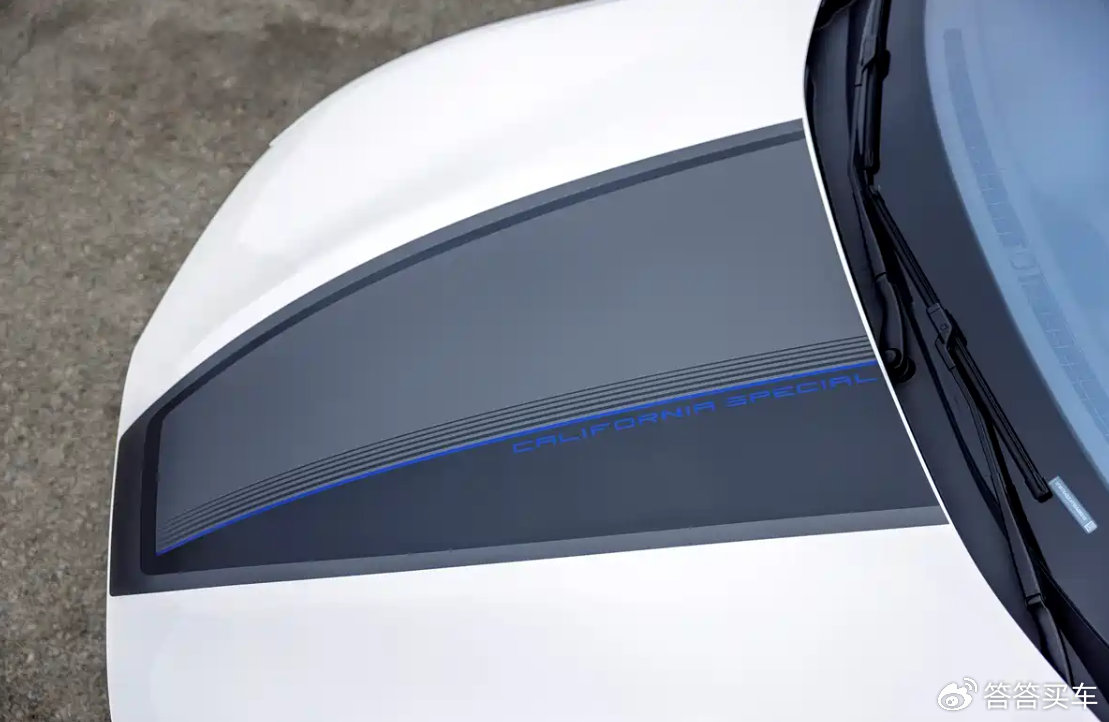 外觀方面,新車采用更具立體感的熏黑格柵,格柵中央帶有藍色野馬標識,前機蓋位置增加了拉花裝飾,提供一款全新樣式的輪圈。新車在車門底部搭配了藍色Mach-E 4標識,車尾的GT標識內部有縮小的California Special字樣。