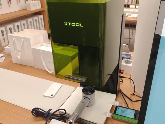 以「DIY」為例:徠芬直接在旗艦店里準備了一臺 xTool 激光雕刻機,為用戶提供文字、圖案的激光鐫刻服務:用戶購買產品后可以掃碼上傳圖片,在工作人員的幫助下為產品打上贈言。未來,徠芬也會在更多門店里提供更豐富的個性化服務。